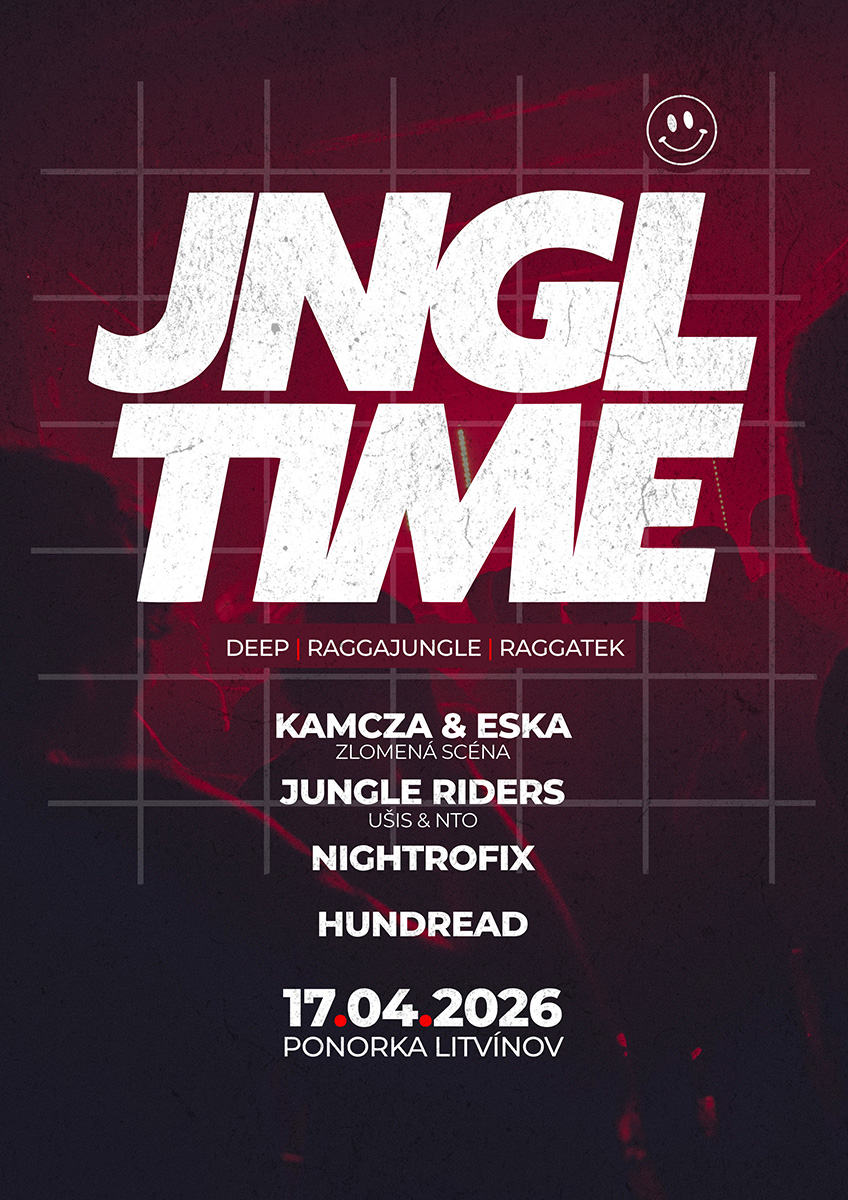 Hudební klub Ponorka Litvínov se v pátek 17. dubna 2026 „promění v pořádnou divočinu“. Do litvínovského podzemního klubu se po hodně dlouhé době vrací partička JUNGLE TIME se svým mejdanem. A vrací se samozřejmě s náloží „raggajungle, deep a raggateku až do rána“! O zábavu se u mixu budou starat Eska & Kamcza (Zlomená Scéna), Jungle Riders aka Ušis & NTO, Nightrofix a samozřejmě v neposlední řadě Hundread.